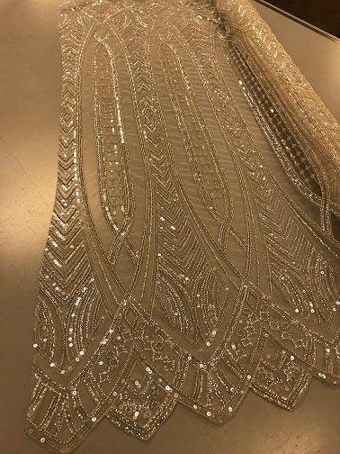 Beautifully beaded and sequined tulle in an art deco style pattern runnning vertically across the width of fabric. Highly decorative and finished to a very high standard this fabric is ideal for bridal overlays.